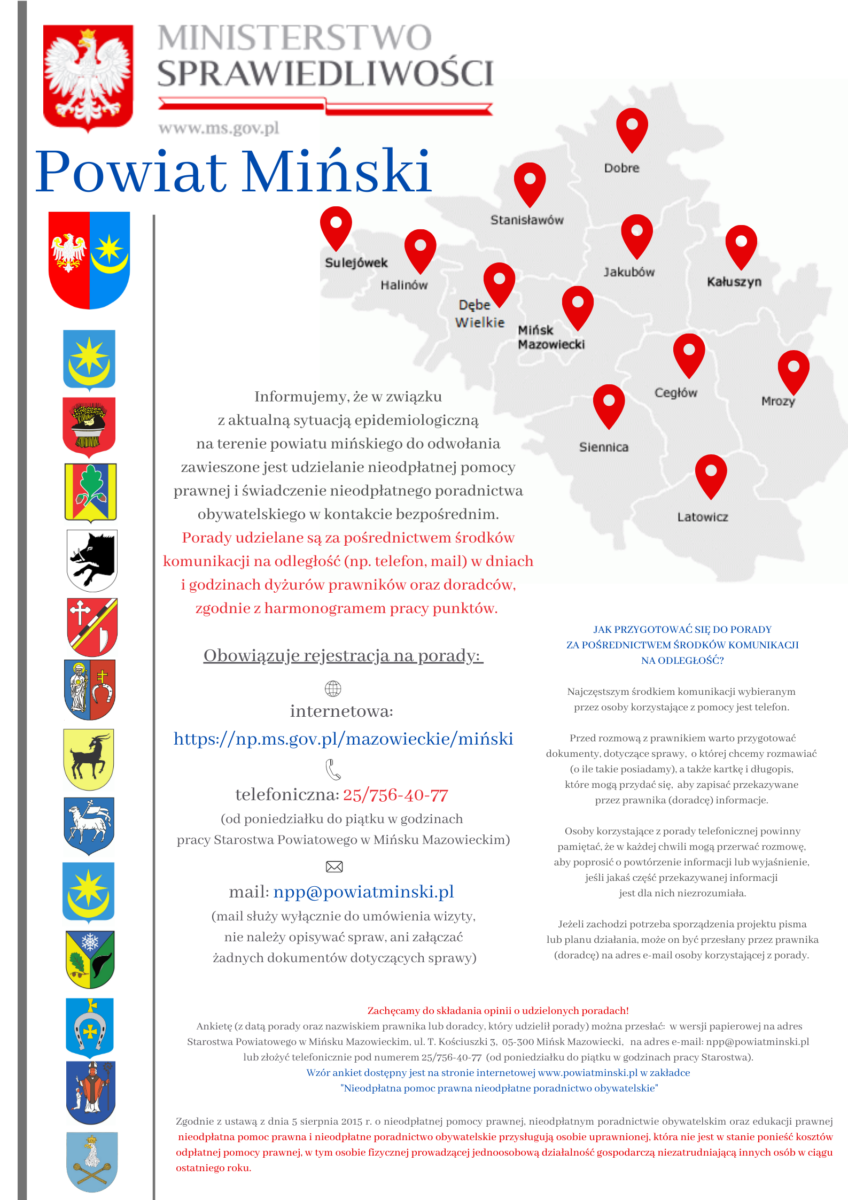 Informujemy, że w związku z aktualną sytuacją epidemiologiczną na terenie powiatu mińskiego do odwołania zawieszone jest udzielanie nieodpłatnej pomocy prawnej i świadczenie nieodpłatnego poradnictwa obywatelskiego w kontakcie bezpośrednim.