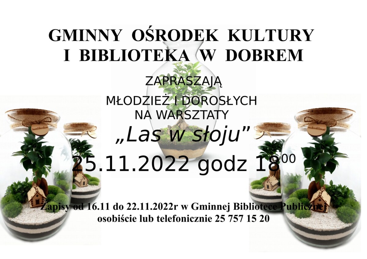 Gminny Ośrodek Kultury i Biblioteka zapraszają dorosłych i młodzież na warsztaty „Las w słoju”, które odbędą się 25.11.2022 godz. 18:00. Zapisy od 16.11 do 22.11.2022r w Gminnej Bibliotece Publicznejosobiście lub telefonicznie 25 757 15 20.