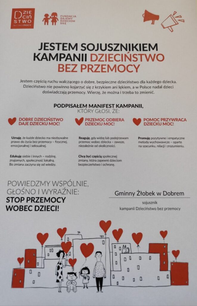 Dzieciństwo to fundament życia. Powinno być okresem wsparcia, obecności i docenienia przez dorosłych. Etapem życia, w którym dziecko czuje się bezpieczne ,widziane i kochane. 1 9 listopada to MIĘDZYNARODOWY DZIEŃ PRZECIWDZIAŁANIA PRZEMOCY WOBEC DZIECI, wyjątkowy moment, aby zwrócić uwagę na problem przemocy fizycznej, psychicznej i emocjonalnej, której doświadczają dzieci na całym świecie. Dzisiejszy dzień to także finał OGÓLNOPOLSKIEJ KAMPANII„DZIECIŃSTWO BEZ PRZEMOCY” w którą włączyła się nasza placówka. Gminny Żłobek w Dobrem przybrał dziś barwy czerwone ,aby solidarnie sprzeciwić się przemocy wobec dzieci. Każde dziecko zasługuje na bezpieczne dzieciństwo!!!