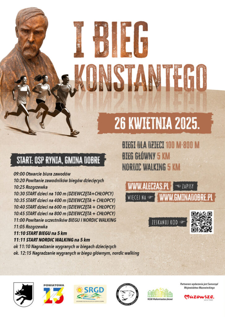 26 kwietnia 2025 roku Rynia tętniła życiem – wszystko za sprawą I Biegu Konstantego, który zgromadził biegaczy, kibiców, dzieci i całe rodziny z powiatu mińskiego i nie tylko. Wydarzenie poświęcone było 160. rocznicy urodzin Konstantego Laszczki, wybitnego artysty i pedagoga związanego z gminą Dobre. To właśnie jego postać stała się symbolicznym patronem tego dnia – łączącego sport, edukację i historię.