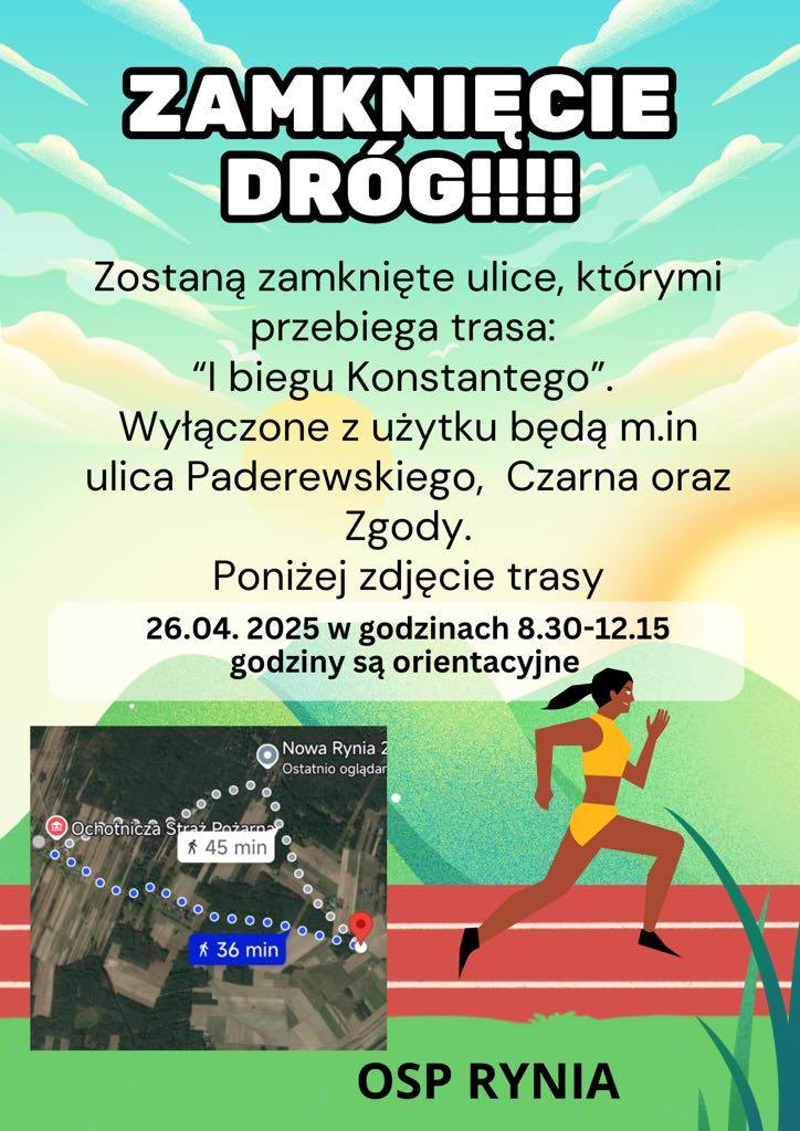 w związku z organizacją Pierwszego Biegu Konstantego, w sobotę 26 kwietnia 2025 r., w godzinach od około 8:30 do 12:15, nastąpi czasowe zamknięcie wybranych ulic na terenie Ryni, m.in.: ul. Paderewskiego, ul. Zgody, ul. Czarna