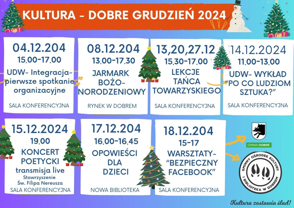 Zapraszamy serdecznie na wyjątkowe wydarzenia grudniowe! Czekają na Was niezapomniane chwile, świąteczna atmosfera i wiele atrakcji. Do zobaczenia!
