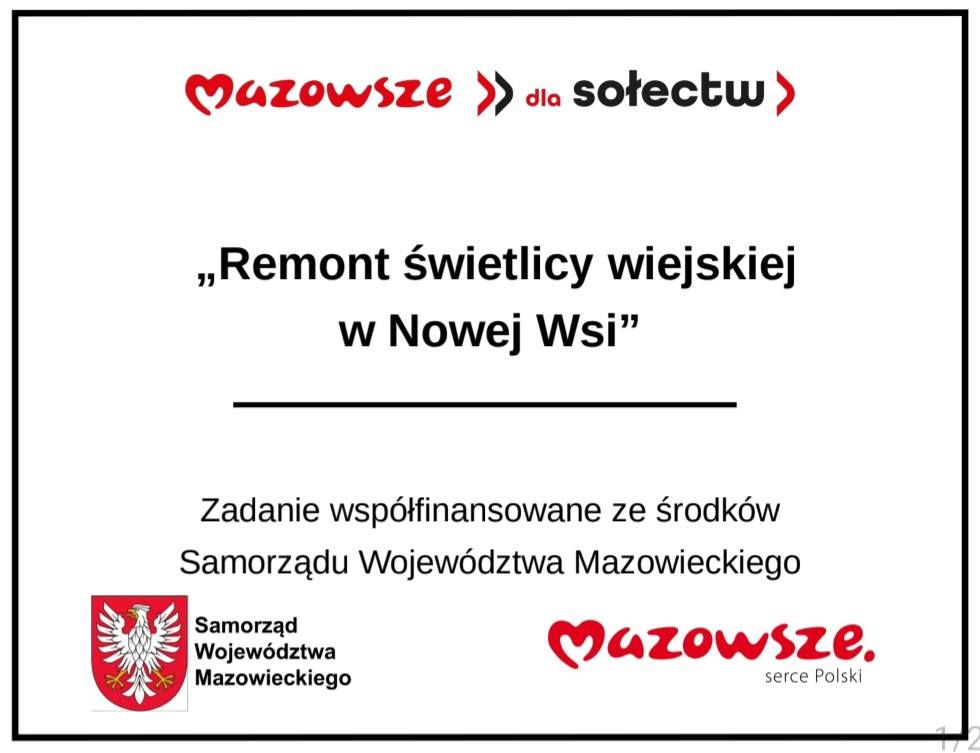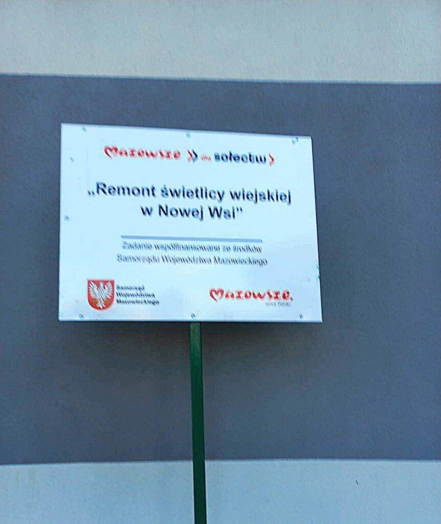 W ramach przedsięwzięcia wykonano remont świetlicy wiejskiej w Nowej Wsi, obejmujący wymianę instalacji elektrycznej, wykonanie instalacji grzewczej oraz malowanie ścian i sufitów.