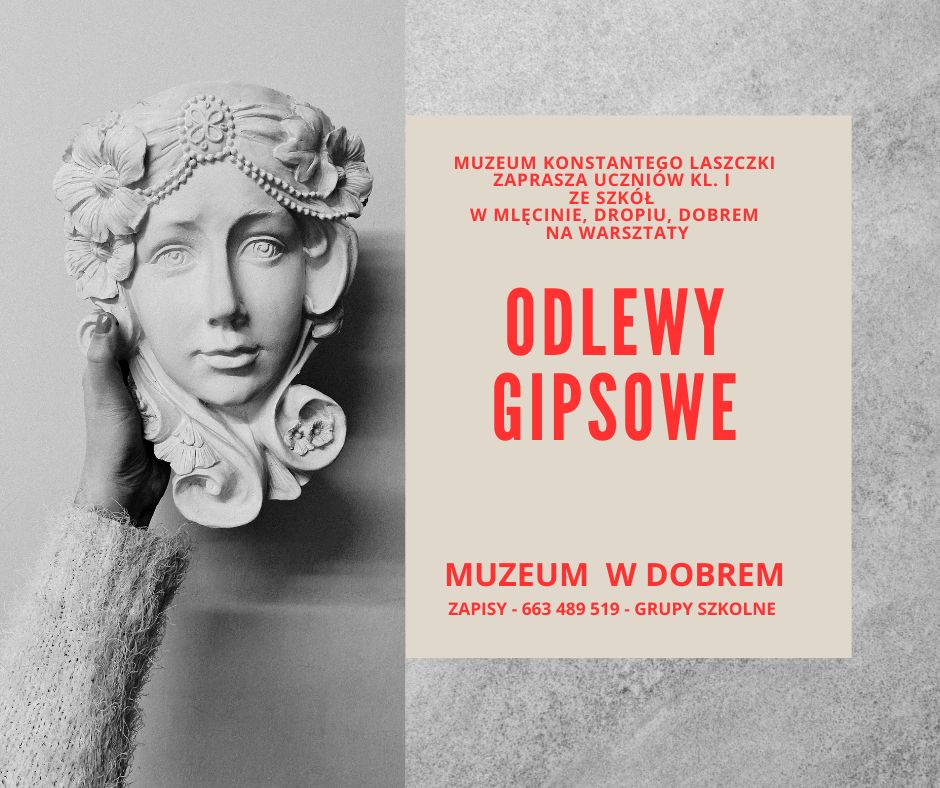 Muzeum Konstantego Laszczki zaprasza uczniów klasy I ze szkół w Mlęcinie, Dropiu i Dobrem na wyjątkowe zajęcia, podczas których będzie można zobaczyć poszczególne etapy tworzenia odlewów gipsowych. Każdy uczestnik otrzyma także suchy odlew do własnoręcznego pomalowania! To nie tylko świetna okazja do odkrycia nowych umiejętności, ale również możliwość bliższego poznania sztuki i kultury w kreatywny sposób!