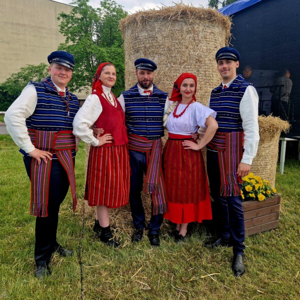 Grupa osób w tradycyjnych strojach ludowych przed belą siana. Mają kolorowe paski i czerwone akcenty. Tło zielone z drzewami.