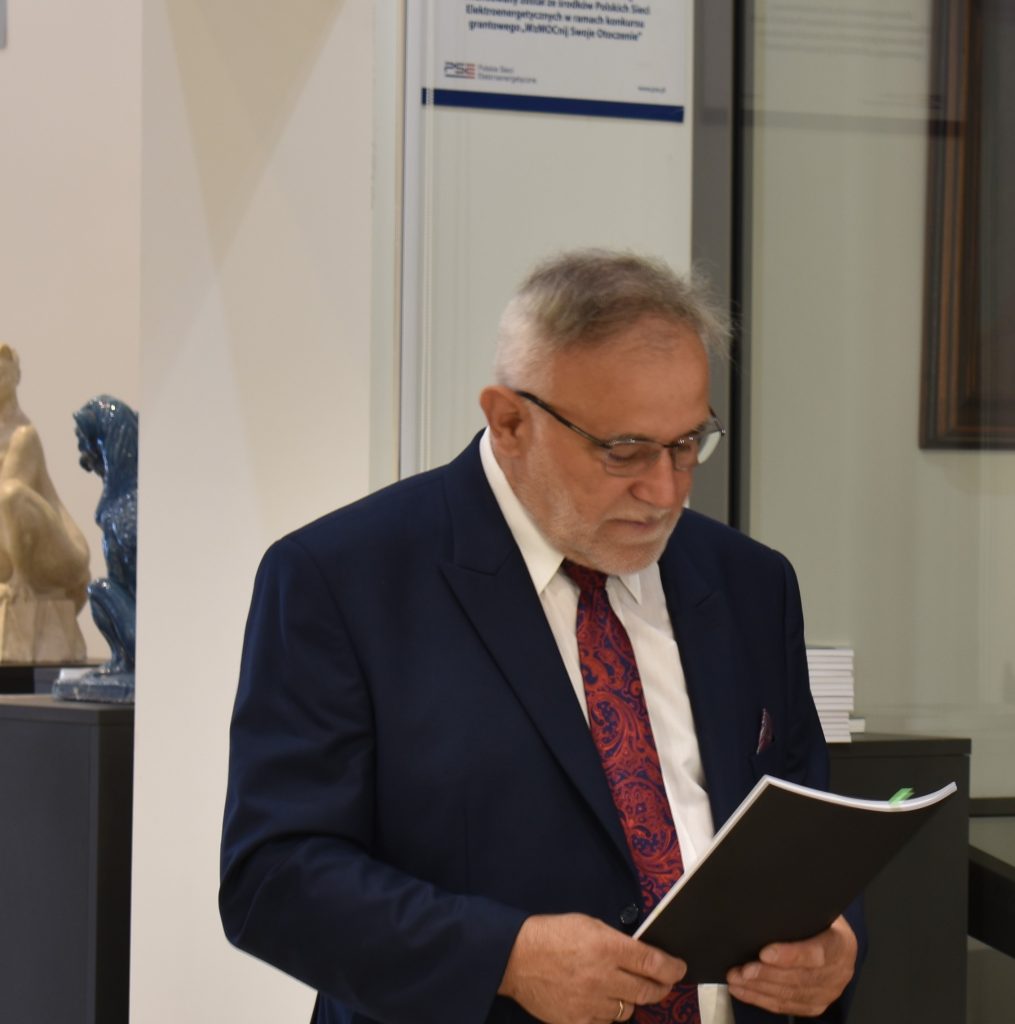 Pan Wójt czyta, reszta uczestników siedzi z zaciekawieniem słuchając. W tle eksponaty Muzeum Konstantego Laszczki