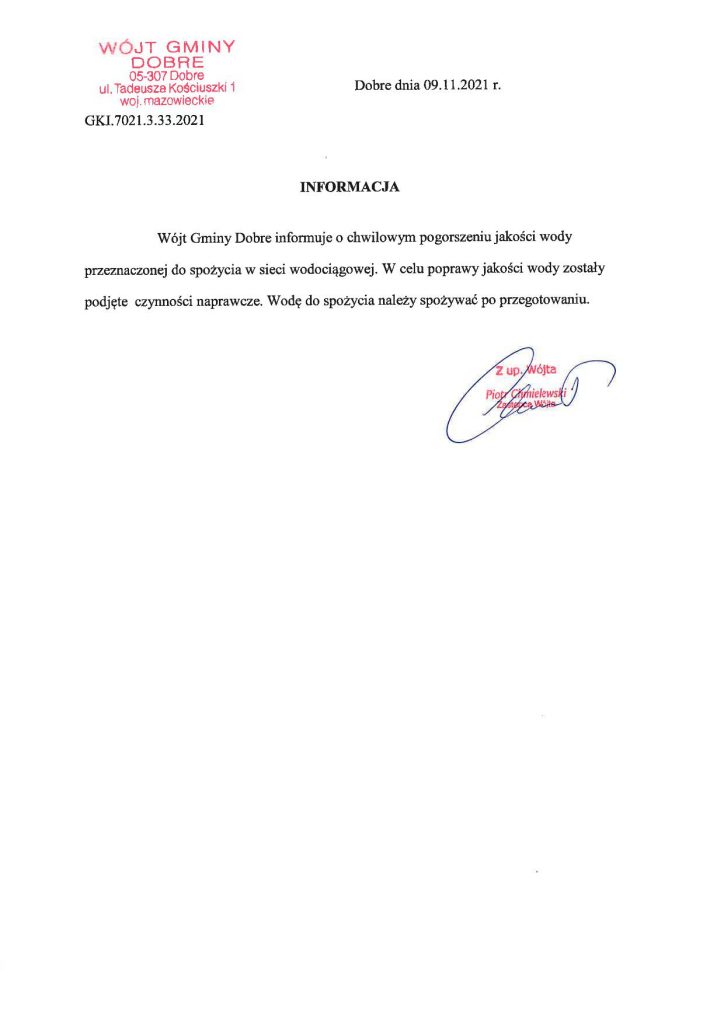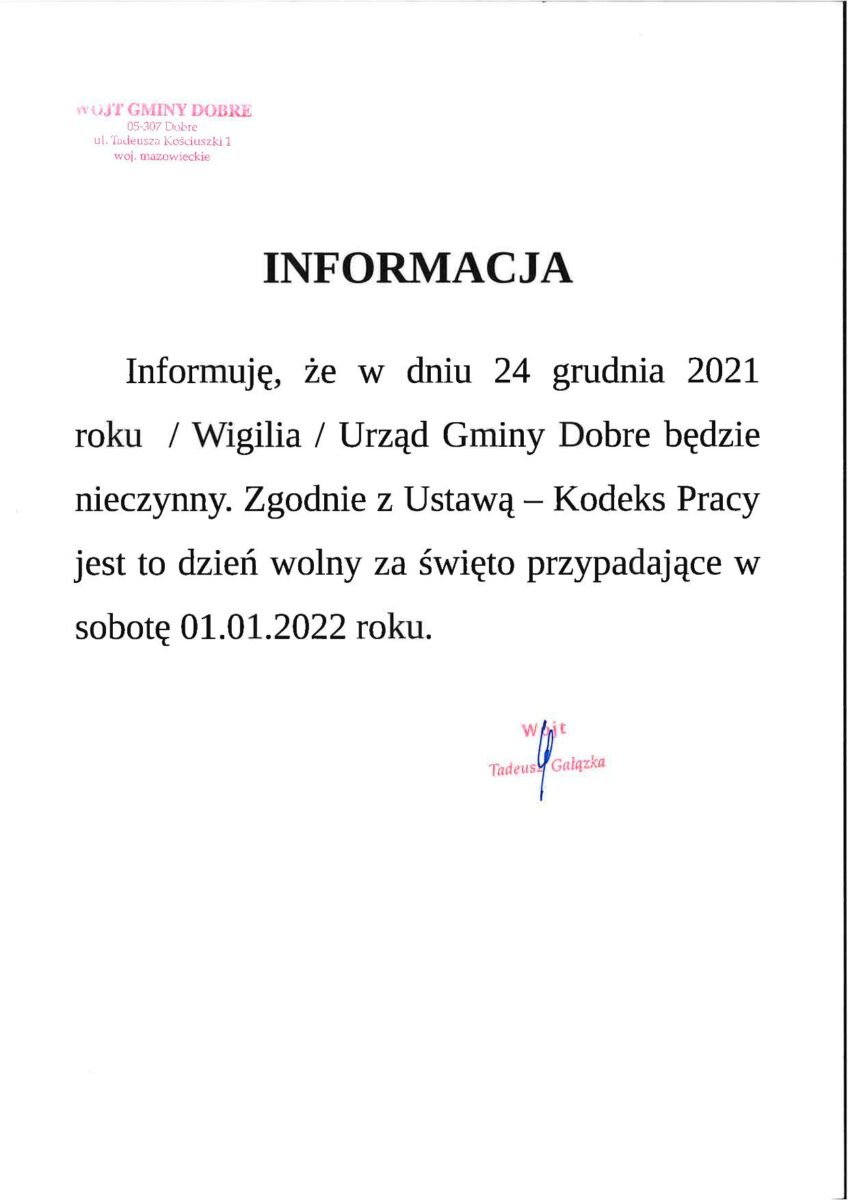 Zgodnie z art. 35 ustawy z dnia 21 sierpnia 1997 roku o gospodarce nieruchomościami (Dz. U. z 2021r., poz. 1899) Wójt Gminy Dobre informuje, że na tablicy ogłoszeń Urzędu Gminy Dobre oraz na stronie internetowej www.dobre.ovh dostępny jest wykaz nieruchomości przeznaczonych do dzierżawy na czas określony.