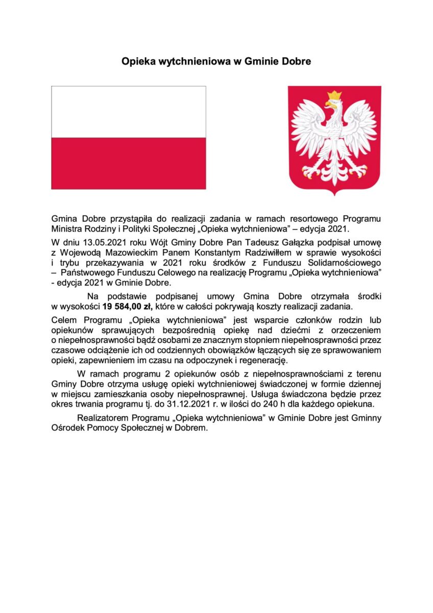 Gmina Dobre przystąpiła do realizacji zadania w ramach resortowego Programu Ministra Rodziny i Polityki Społecznej „Opieka wytchnieniowa” – edycja 2021.
