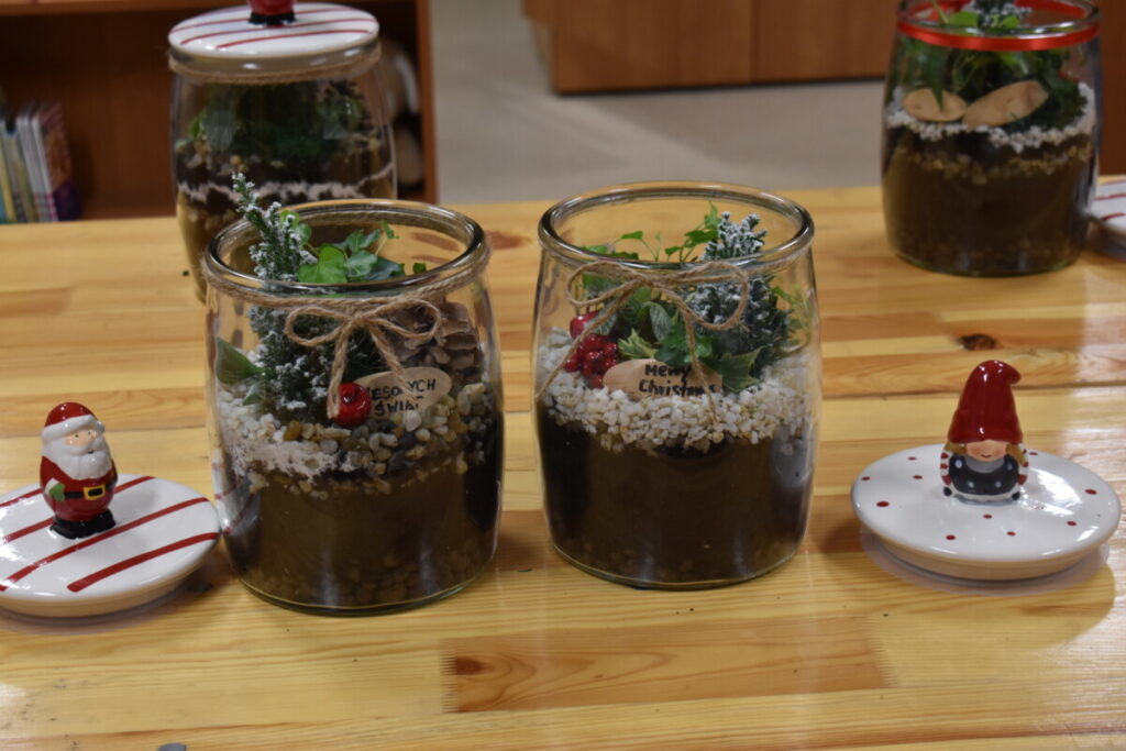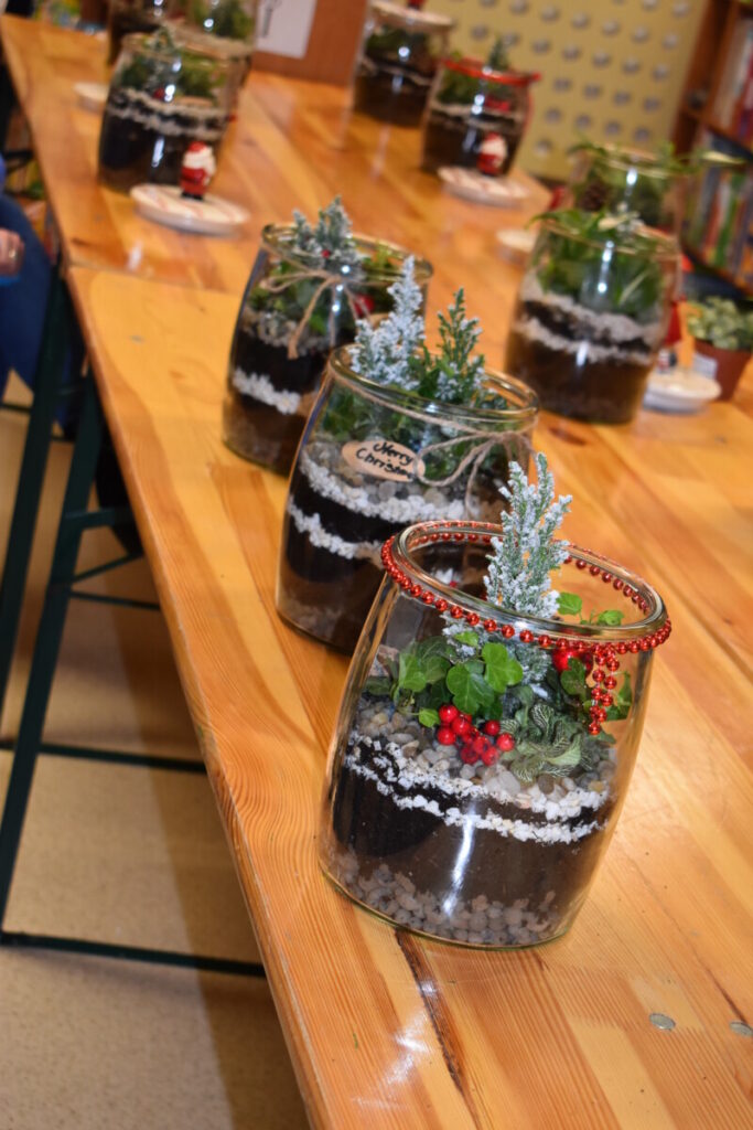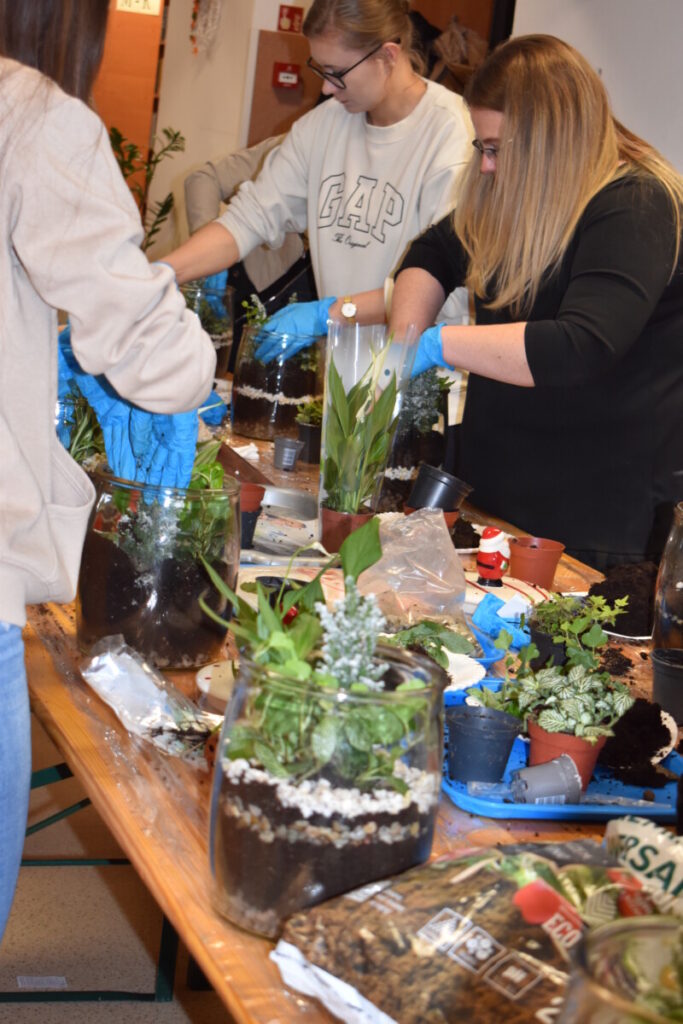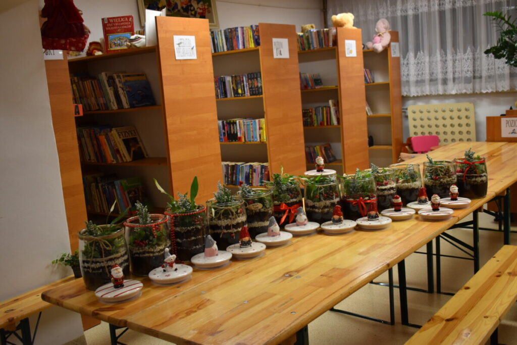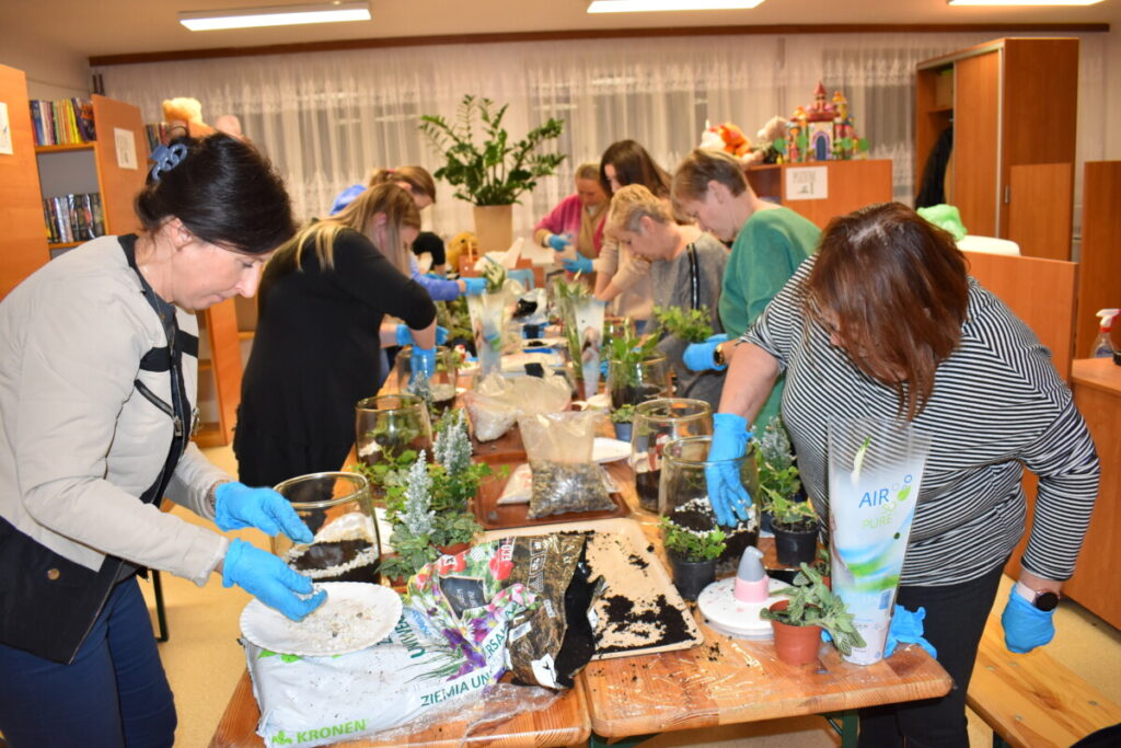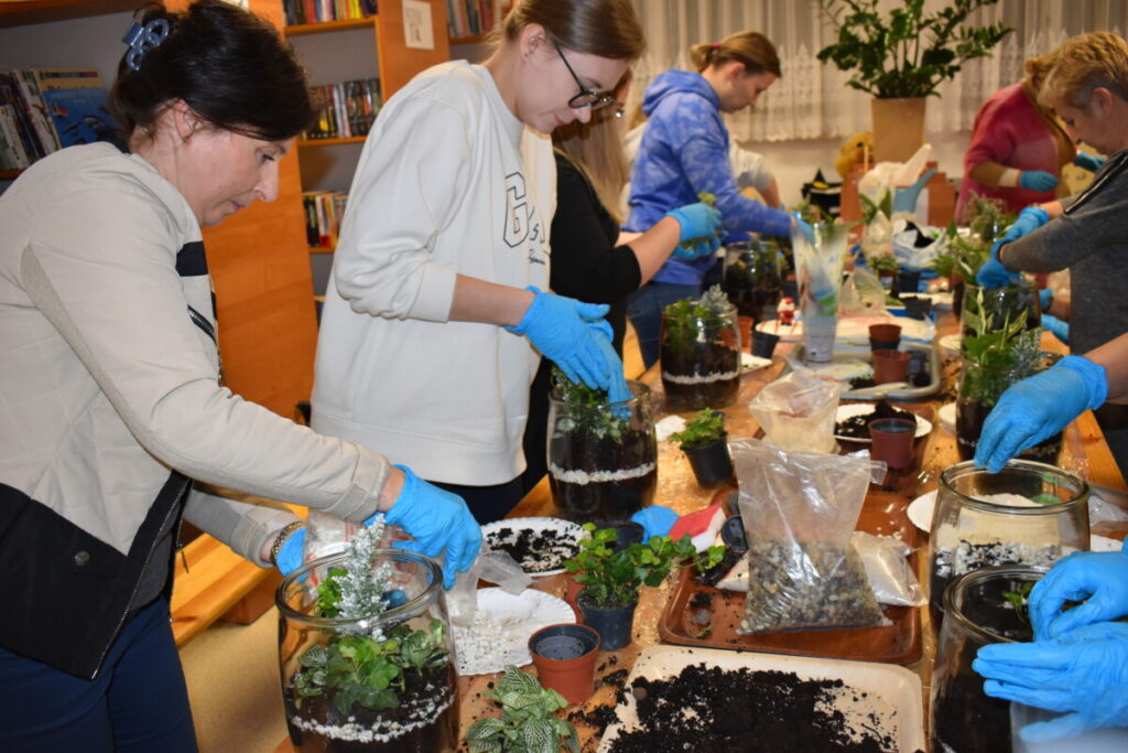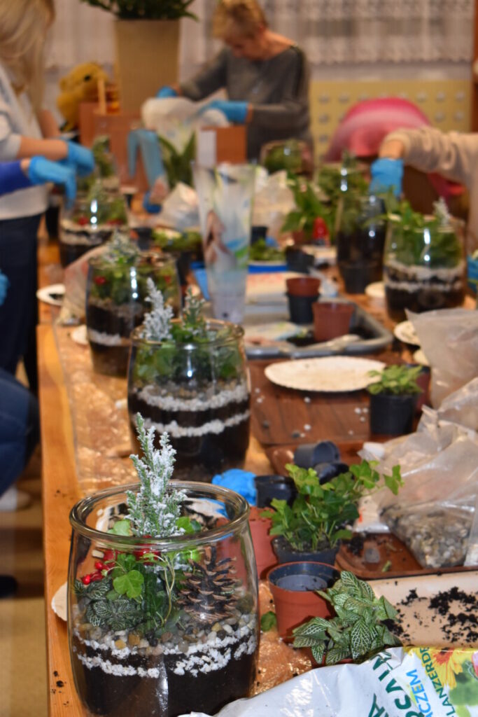 25 listopada Gminny Ośrodek Kultury zorganizował warsztaty dla dorosłych„Las w słoiku” podczas których uczestnicy dowiedzieli się , jak stworzyć swój własny mały ekosystem. Raz umieszczona w naczyniu roślinność nie potrzebuje więcej zabiegów pielęgnacyjnych – zamknięty obieg sprawia, że mały las ma odpowiednią ilość wilgoci, żeby przetrwać. W trakcie warsztatów przedstawiono poszczególne etapy pracy nad leśnym słoikiem. Tworzenie miniaturowego lasu nie tylko poszerza wiedzę na temat leśnej flory – jest także świetną okazją do rozwoju zdolności manualnych, którymi wykazały się nasze panie. Dziękujemy za wspólna pracę.