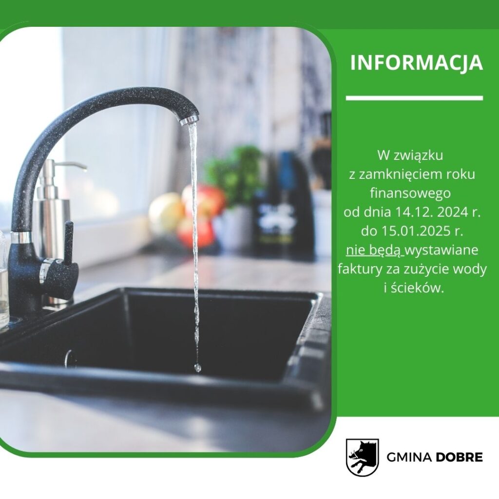 W związku z zamknięciem roku finansowego, w okresie od 14 grudnia 2024 r. do 15 stycznia 2025 r. nie będą wystawiane faktury za zużycie wody i ścieków.