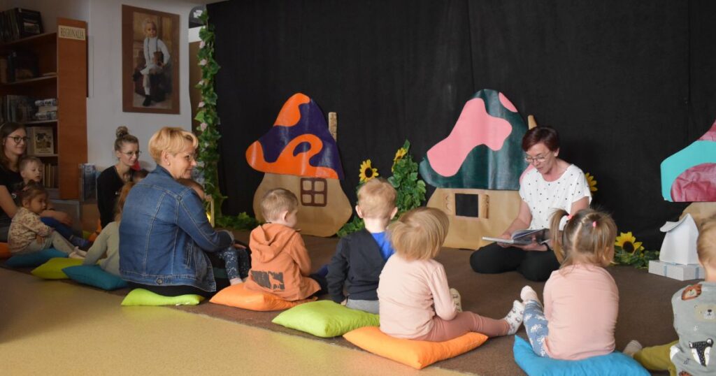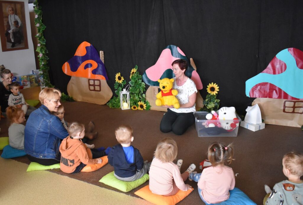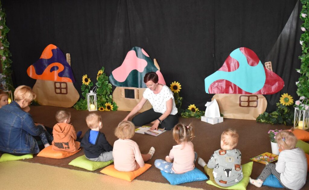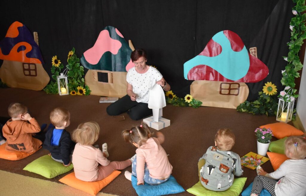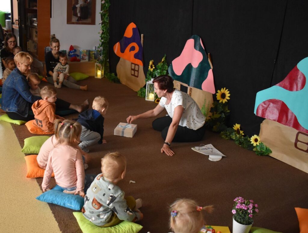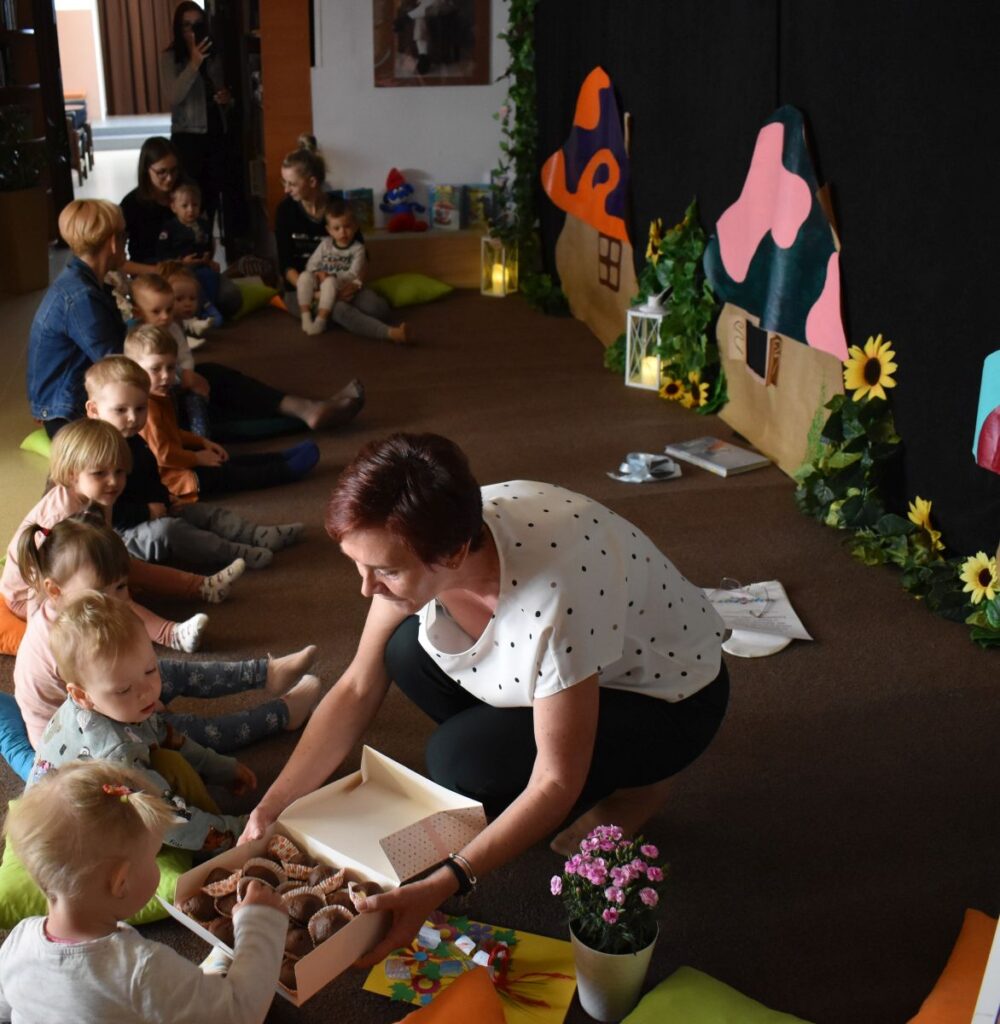 Na wspólne spotkanie do Smerfowej wioski przybyły też dzieci z Gminnego Żłobka i nawet była to grupa Smerfów. Dzieci poznały uroczy świat tych małych ludków i przeżyły radosne przygody w bibliotece. Czekała na nich specjalna słodka przesyłka od Smerfa Zgrywusa. Dzieci mogły zapoznać się z bogatą ofertą literatury dla najmłodszych.