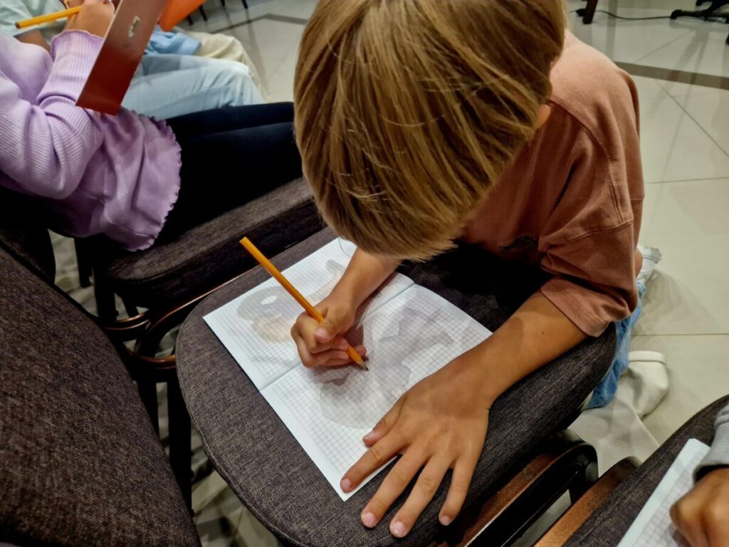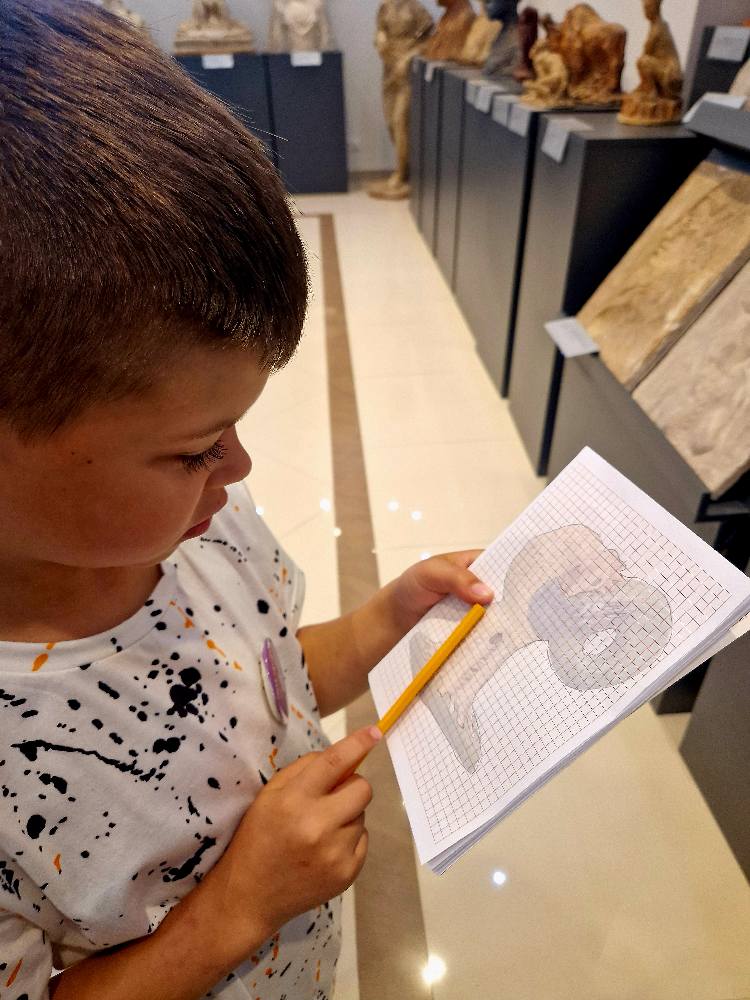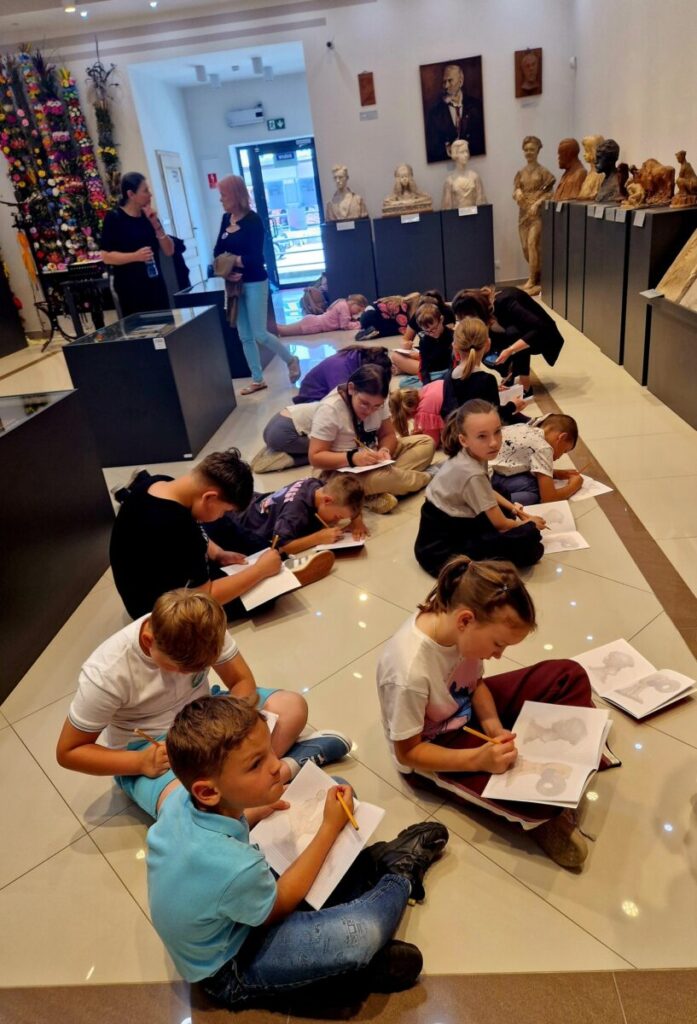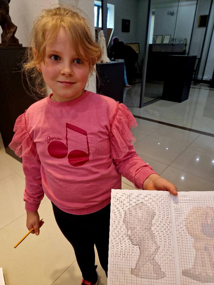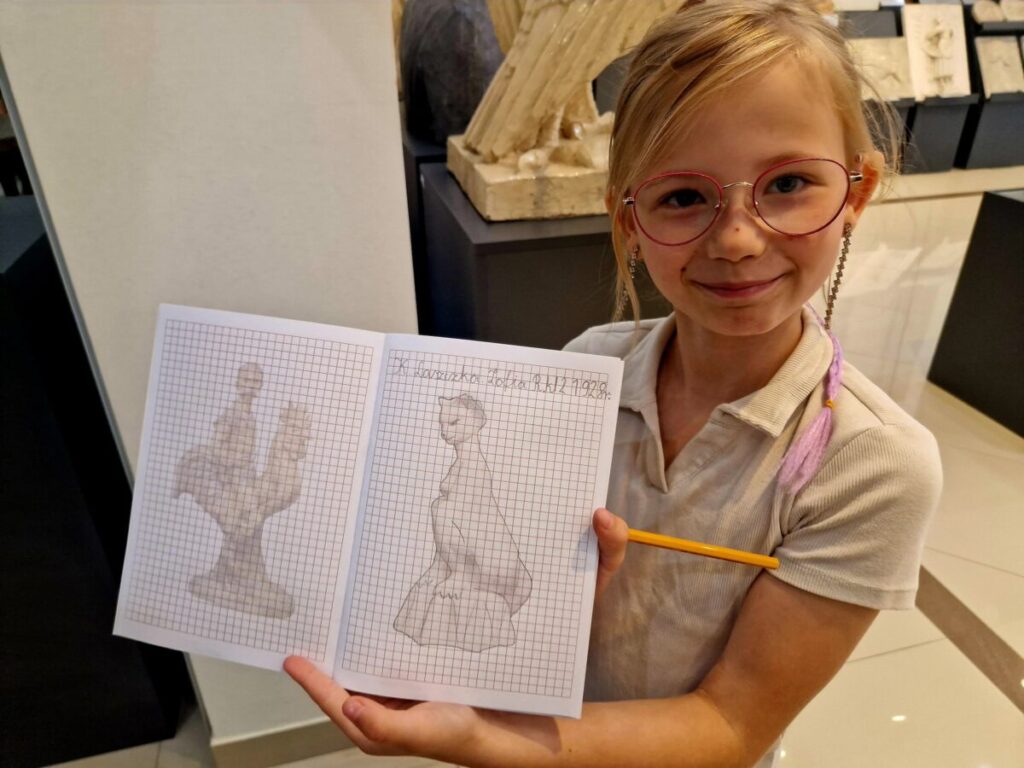 Podczas wizyty rozmawialiśmy o szkicownikach artystów, poznawaliśmy tajniki pracy rzeźbiarzy, a następnie… dzieci same chwyciły za ołówki, by spróbować swoich sił w rysunku. Z kartki na kartkę powstawały prawdziwe małe dzieła – jedne precyzyjne i realistyczne, inne pełne wyobraźni i kreatywnej swobody.