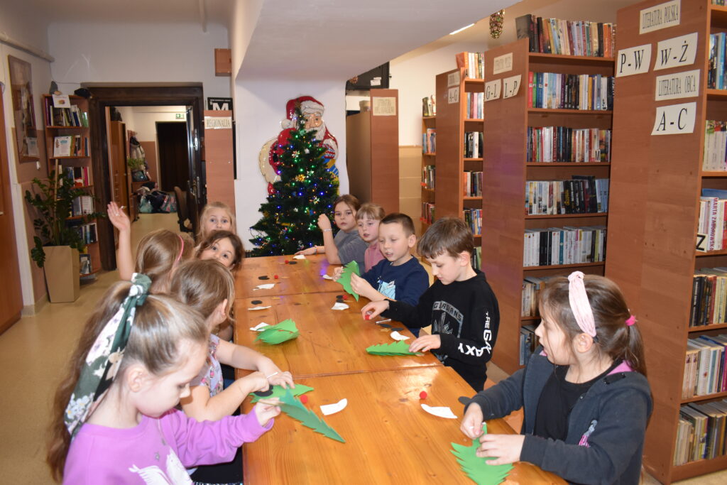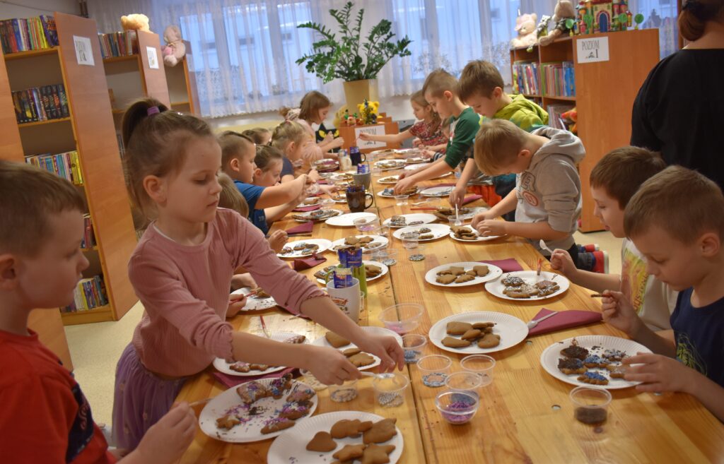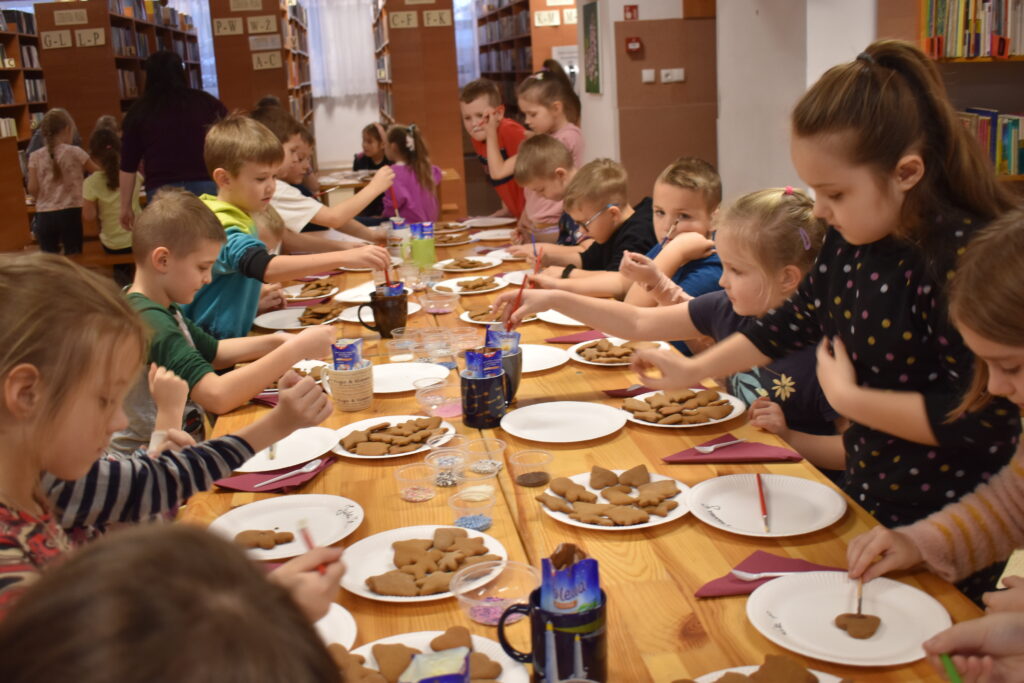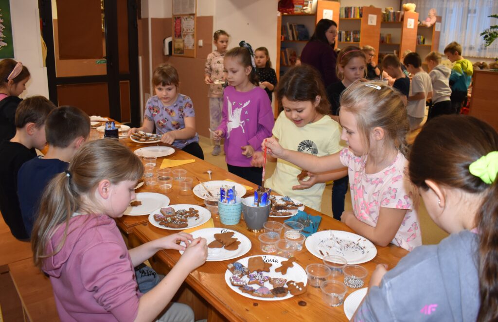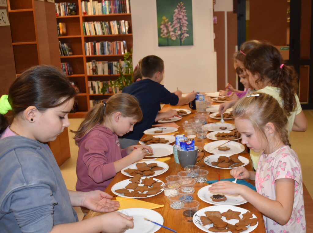 15 grudnia w Gminnym Ośrodku Kultury i Bibliotece odbyły się warsztaty świąteczne dla uczniów klas 0-VII. Młodsza grupa podczas zajęć poznała tajniki sprawnego i precyzyjnego zdobienia pierników. Dzieci miały mnóstwo pomysłów, a swoją pracą efektownie udekorowały ciasteczka używając lukru, polewy i wielu posypek w zimowych kolorach. Gotowe pierniczki zostały zapakowane w pudełko ze świątecznym motywem. Dodatkowym zadaniem było wykonanie choinki według zaprezentowanego wzoru – jak przyznali sami uczestnicy – to doskonała ozdoba pokoju. Przygotowane warsztaty uczyły cierpliwości, opanowania i dążenia do perfekcji.