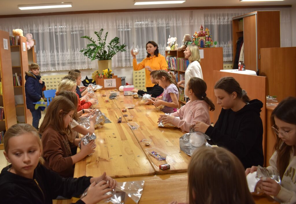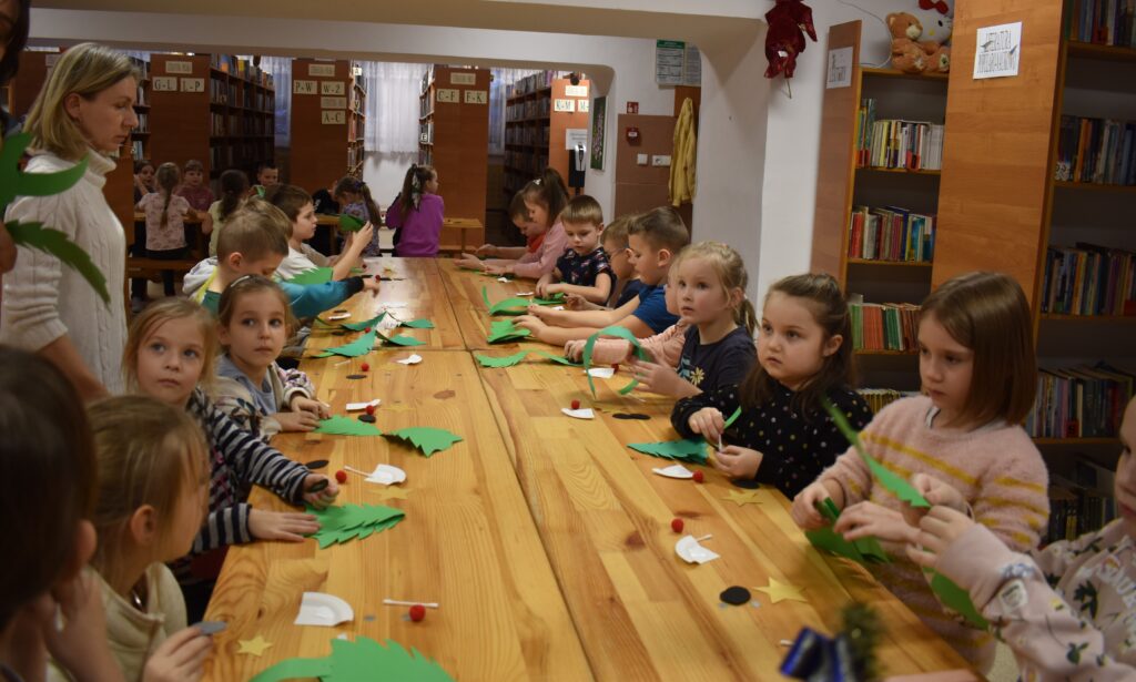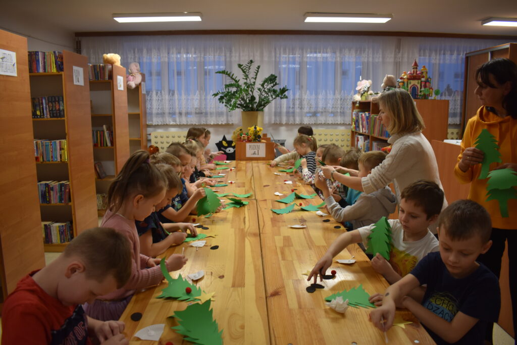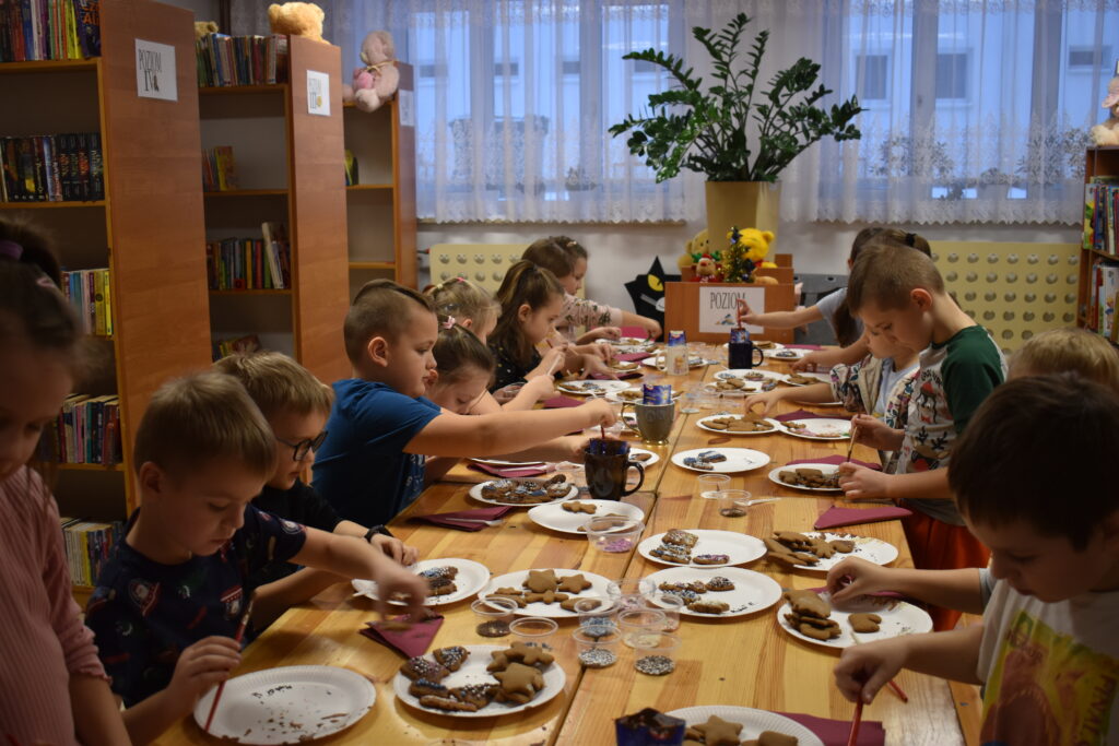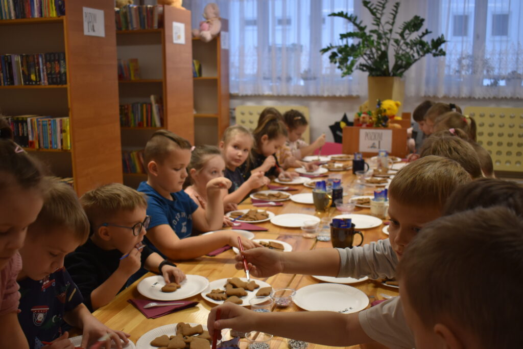 15 grudnia w Gminnym Ośrodku Kultury i Bibliotece odbyły się warsztaty świąteczne dla uczniów klas 0-VII. Młodsza grupa podczas zajęć poznała tajniki sprawnego i precyzyjnego zdobienia pierników. Dzieci miały mnóstwo pomysłów, a swoją pracą efektownie udekorowały ciasteczka używając lukru, polewy i wielu posypek w zimowych kolorach. Gotowe pierniczki zostały zapakowane w pudełko ze świątecznym motywem. Dodatkowym zadaniem było wykonanie choinki według zaprezentowanego wzoru – jak przyznali sami uczestnicy – to doskonała ozdoba pokoju. Przygotowane warsztaty uczyły cierpliwości, opanowania i dążenia do perfekcji.