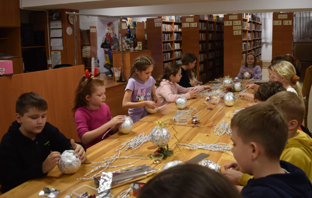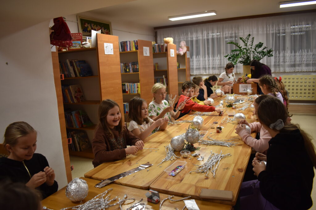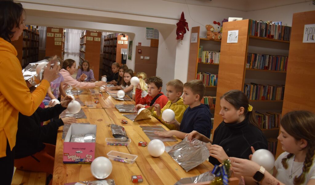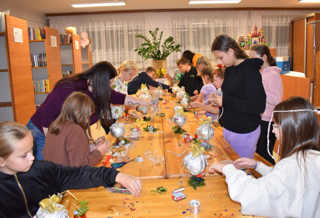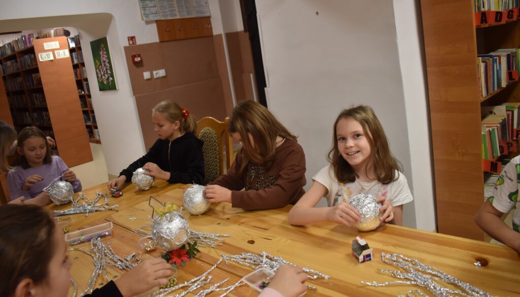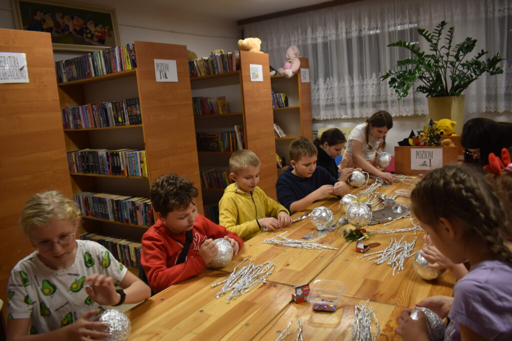Starsza grupa – uczniowie klas II-VII – swoje umiejętności mogli zaprezentować podczas wykonywania bombki dla której dekoracją miała być… folia aluminiowa i odrobina cekinów. Imponujące pomysły uczniów na wykończenie bombki sprawiły, że powstały prawdziwe cuda zamknięte w jednej bombce. Ozdoba została zawieszona na stojaku w kształcie choinki i ozdobiona delikatnym stroikiem. Zajęcia pozwoliły rozwijać zdolności manualne oraz zdolność kreatywnego myślenia.