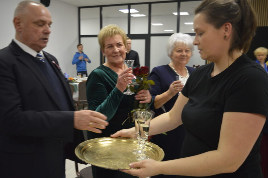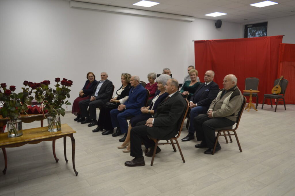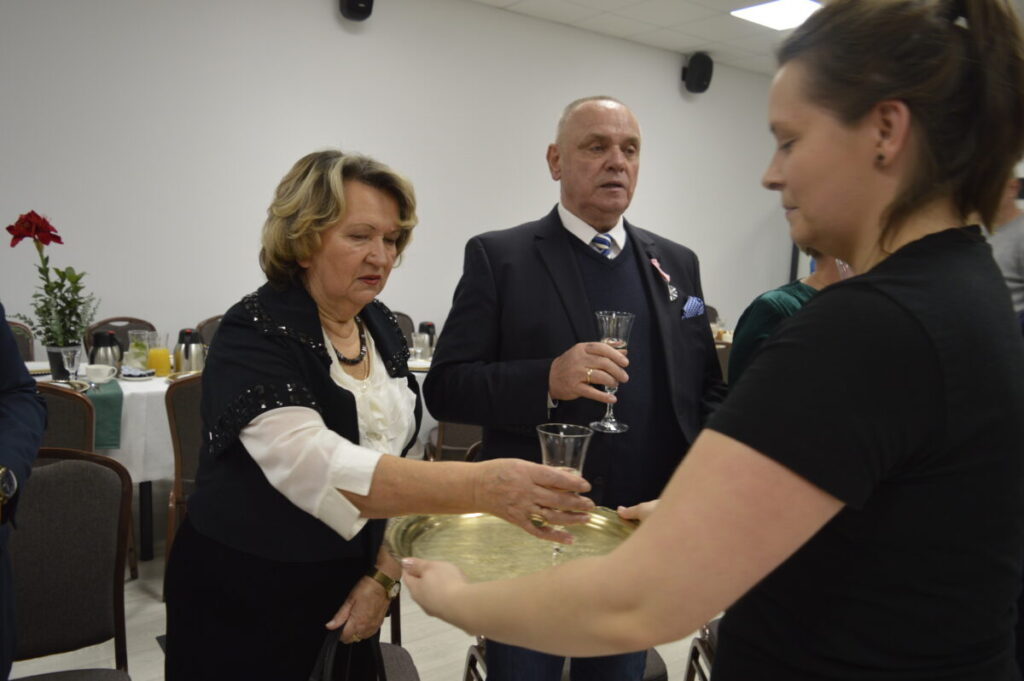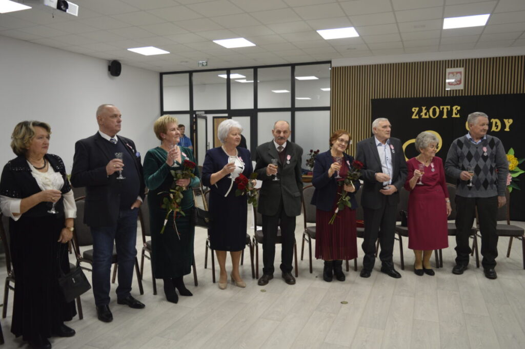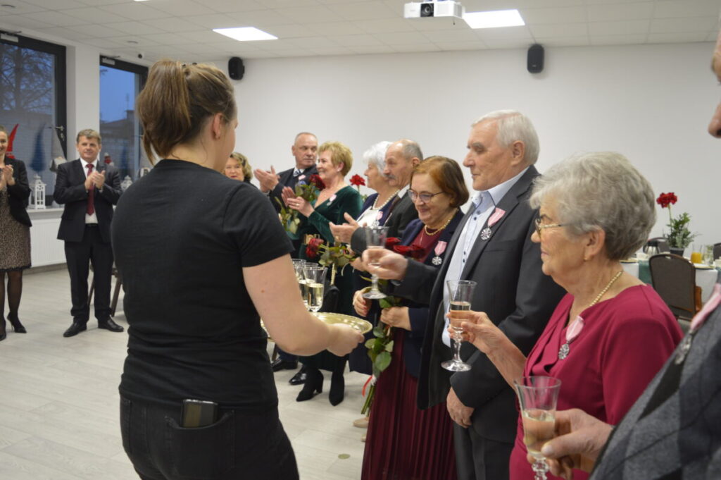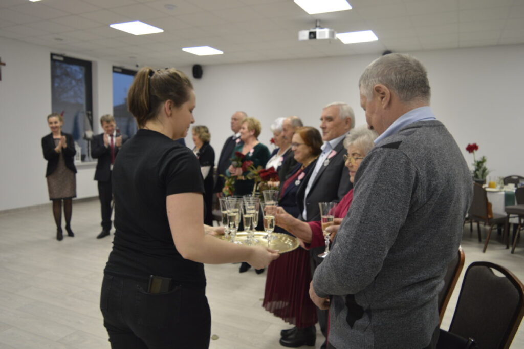 Dostojni Jubilaci wysłuchali życzeń i słów najwyższego szacunku , uznania i podziękowania za trwałość małżeństwa i rodziny. Po ceremonii wręczenia odznaczeń, kwiatów i dyplomów, wszyscy wznieśli symboliczny toast lampką szampana. Nie zabrakło również przepysznego tortu, śpiewu i tańca.