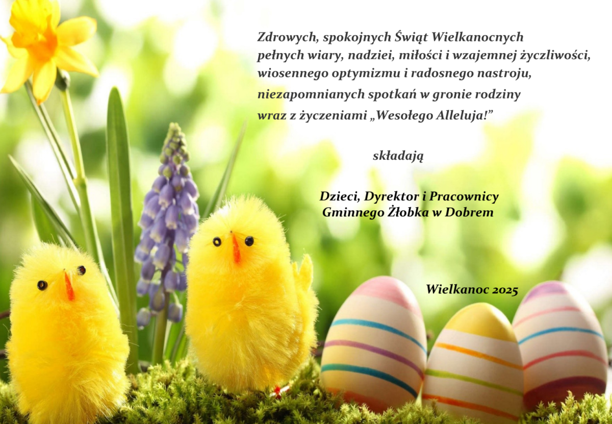 Zdrowych, spokojnych Świąt Wielkanocnych pełnych wiary, nadziei, miłości i wzajemnej życzliwości, wiosennego optymizmu i radosnego nastroju, niezapomnianych spotkań w gronie rodziny wraz z życzeniami „Wesołego Alleluja!”